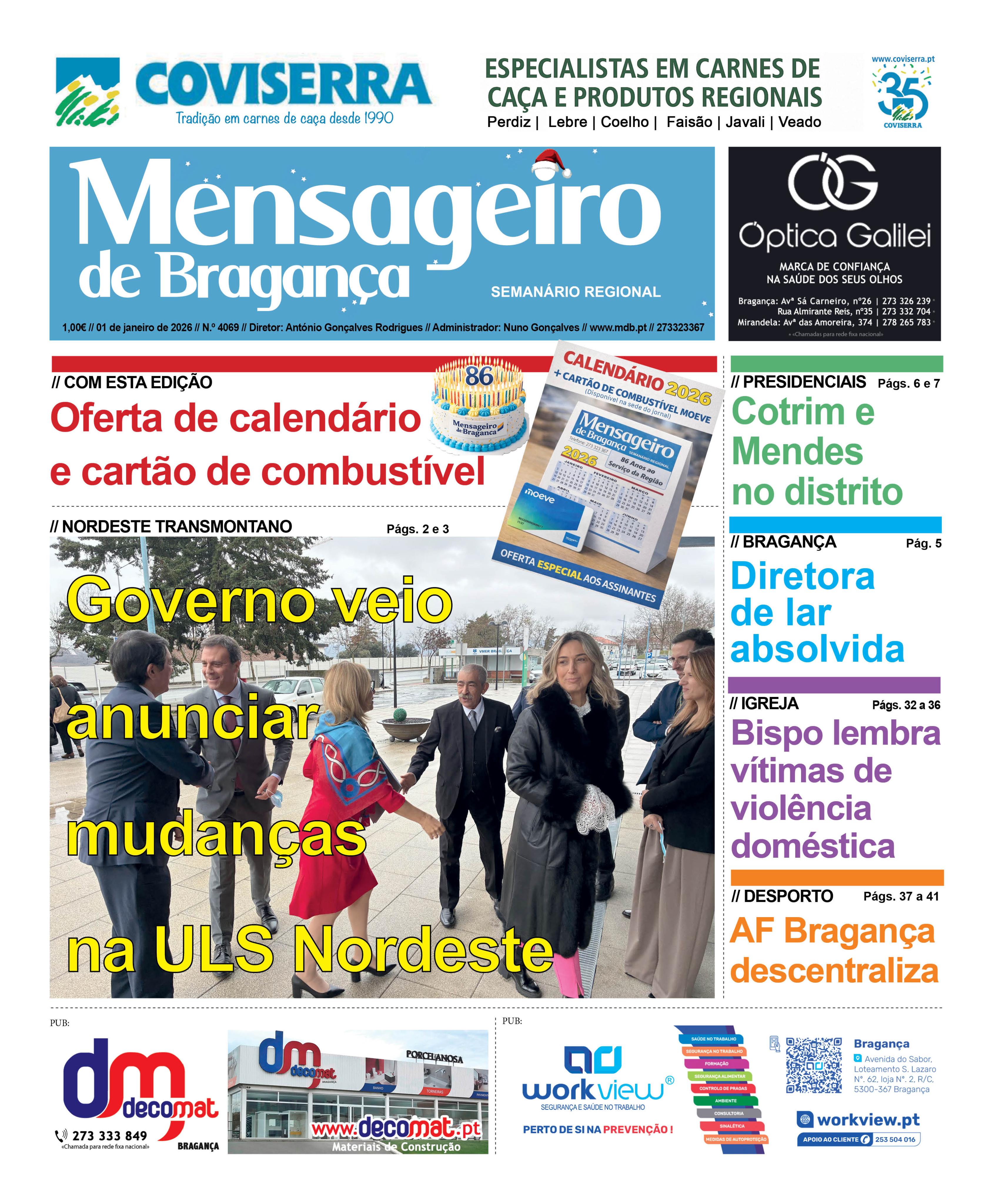 Data Edição Qui, 01/01/2026 - 12:00 Versão completa em PDF, disponível para assinantes. Informação acerca das assinaturas aqui Para fazer login aqui Notícias nesta edição: Dois jovens de 16 anos feridos em despiste de mota Corrida de São Silvestre tida como uma das mais importantes do Nordeste Transmontano Rui Teixeira vence São Silvestre de Mirandela à frente de Rui Muga Dois detidos por suspeita de tráfico de droga Eleições no Ginásio Clube de Bragança marcadas para domingo Antiga diretora de lar de idosos de Rebordãos foi absolvida de todos os crimes Motocruzeiro Racing Academy faz balanço positivo da temporada 2025 Ciclistas brigantinos Flávio Cipriano e Francisco Pires reforçam o CD Aves em 2026 Escola Crescer inicia luta pela manutenção no Nacional Sub-15 fora de casa Bragança arranca 2.ª fase do Nacional Sub-19 no reduto do GD Prado “São Silvestre” de Mirandela bate novo recorde com 600 inscritos Promessa do ciclismo brigantino integrou trabalhos da Seleção Nacional Sub-17 SC Mirandela conhece calendário da 1.ª fase da Taça Nacional Feminina Sub-19 Entrega de Placas e Diplomas de Certificação reuniu clubes em Torre de Moncorvo AF Bragança aposta na descentralização com nova filial em Torre de Moncorvo Assembleia Municipal aprovou orçamento municipal de 34, 1 milhões de euros para 2026 Câmara aprova por maioria com uma abstenção do PS orçamento de 29 milhões de euros Urgência médico-cirúrgica mantém-se encerrada enquanto não houver mais médicos À terceira foi de vez e junta das Aguieiras já tem Executivo instalado Luís Simão assume liderança do Clube Atlético de Macedo de Cavaleiros Opiniões nesta edição: